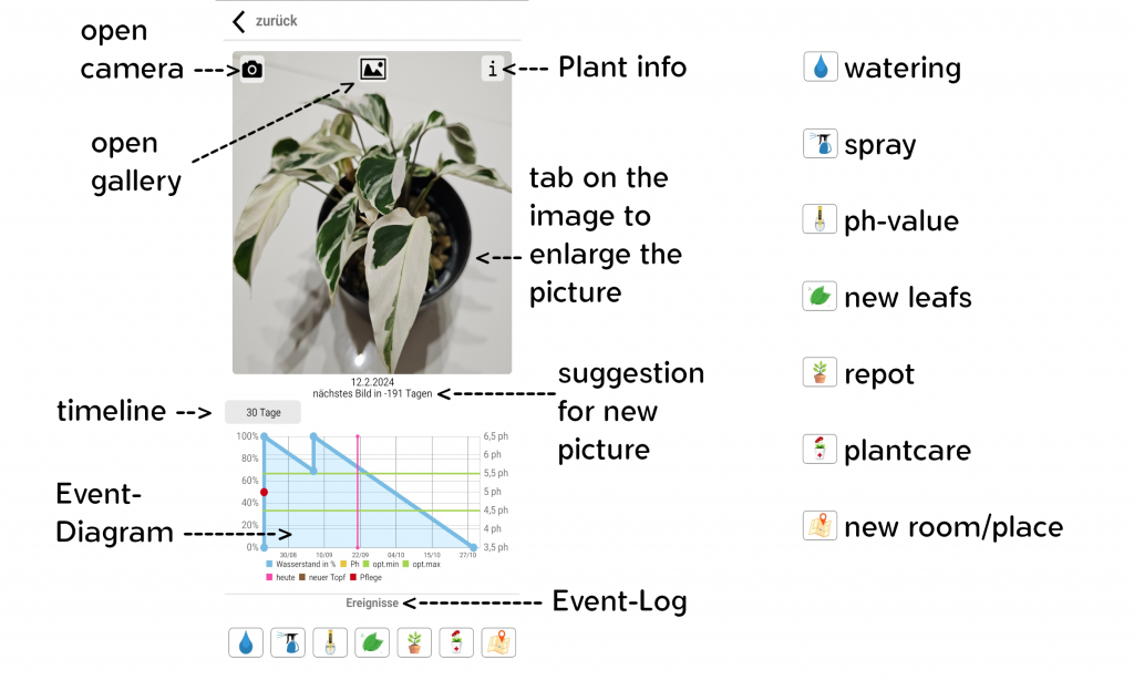 Estas entradas se muestran en un diagrama claro, que proporciona una visión general de todas las medidas de cuidado realizadas. De esta manera, puedes cuidar tus plantas de manera óptima y mantenerlas saludables a largo plazo.